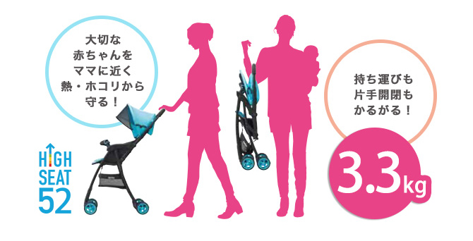 ด้วยความสูงของเบาะนั่งจากพื้นสูง52 cm. (Highseat 52) จึงช่วยลดความร้อนจากพื้นได้ถึง 2 องศา และลดระดับความหนาแน่นของฝุ่นละอองในอากาศได้ถึง 10-20 % และน้ำหนักรถเข็นเด็ก Aprica รุ่น Magical Air Plus Highseat เบาเพียง 3.3 kg. เหมาะกับคุณแม่ที่ต้องออกเดินทางกับลูกน้อยเพียงแค่ 2 คน ทำให้คล่องตัวได้มากขึ้น และลูกน้อยรู้สึกสบายตัวตลอดการเดินทาง